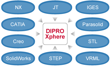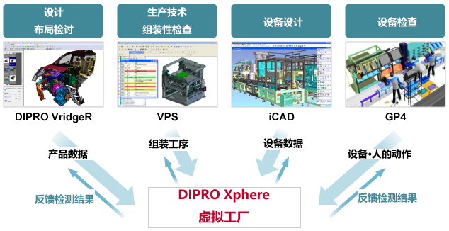 生产产品的工厂,有根据组装顺序的产品的组装,生产设备的设计,还有生产线和人的运动。 本公司还开发和销售支持这些业务的软件包。DIPRO Xphere将从这些软件包中获取输出的形状数据、组装顺序等属性、以及验证结果等信息,在VR空间中再现,从人体工学的观点进行验证,并将验证结果反馈给各软件包。